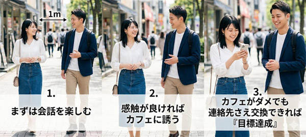 「数打てば当たる」のメンタルで、まずは連絡先交換を目標にするのが現実的。